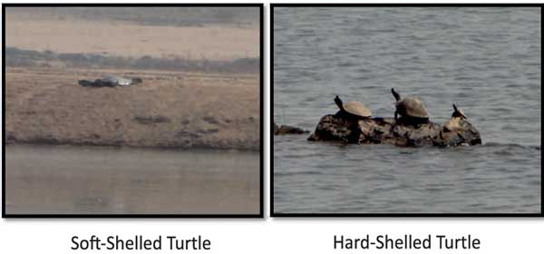 Enumeration of turtles by individual species, when basking in same size groups, is difficult from a distance. Turtle sightings during the survey were categorized as hard or soft- shell turtles. The number of turtles sighted during such surveys is not indicative of the actual population size of turtles in the river. The data shown below only represents the population which was seen by the survey team. All turtles sighted were counted and noted on the data sheets. A total of 90 turtles (47 hard shell turtles and 43 soft shell turtles) were sighted during the present survey (Table -1).