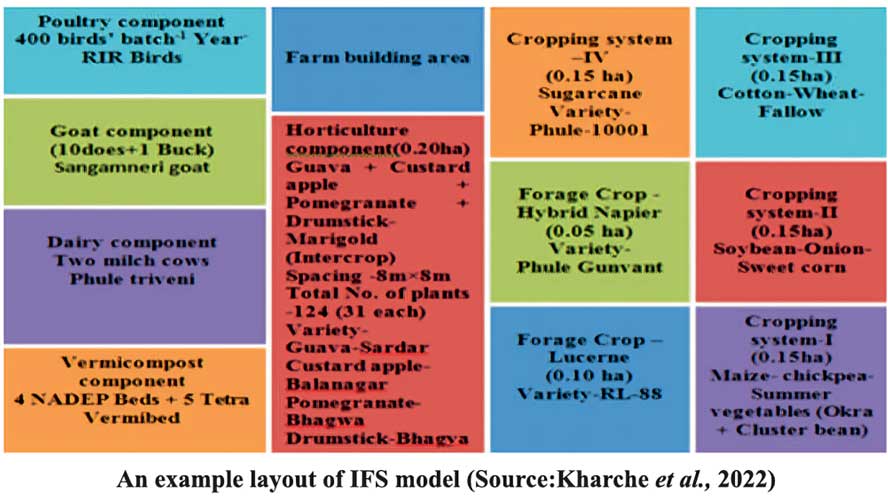 Crops, livestock, birds and trees are the major components of any IFS. Crop may have subsystem like monocrop, mixed/intercrop, multi-tier crops of cereals, legumes (pulses), oilseeds, forage etc. Livestock components may be cow, goat, sheep, poultryand bees. The farming system takes into account the components of soil, water, crops, livestock, labour, capital, energy and other resources, with the farm family at the centre managing agriculture and related activities. The followings are integrated components of IFS (Behera et al., 2018).