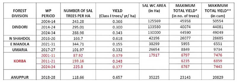 The calculation clearly demonstrates that the intensity of felling is extremely low. On average, more than 200 Sal trees are present per hectare, while the prescribed yield amounts to only a fraction of a single tree per hectare per year. For instance, in divisions with the highest recruitment, the figure is about 0.6 tree per hectare per year, against a standing stock of roughly 166 Sal trees per hectare. Placed in perspective, removing less than one tree annually from a hectare containing hundreds of Sal trees cannot reasonably be equated with “destruction of forests.” The scale is simply too small to have any adverse ecological impact. The following table shows the total yield of Sal trees during a year in the division: