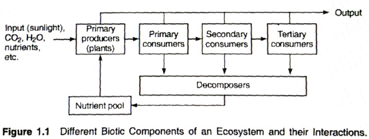 The biotic components of an ecosystem consist of 3 types of organisms: Producers, consumers and decomposers which are shown in Figure 1.1.