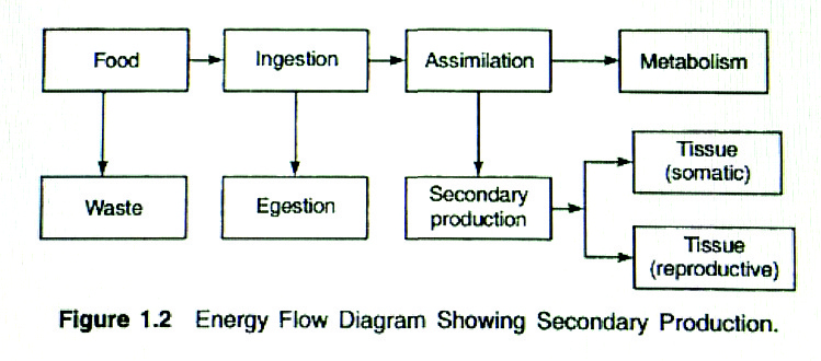 Secondary productivity refers to productivity of heterotrophic organisms like herbivores, carnivores and decomposers. It is the net amount of energy transferred and stored in the tissues (somatic and reproductive) of heterotrophs over a period of time. The following energy flow diagram is useful to understand this. (Figure 1.2)