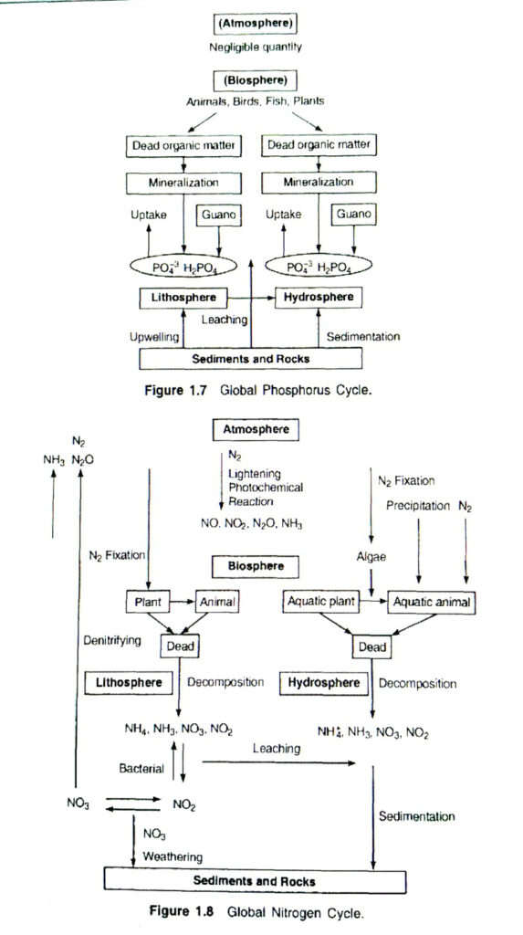 All organisms, from microscopic viruses and bacteria to large mammals are composed of matter which require many elements for iheir life processes. These elements, about 40 in number, are the nutrients essential for the growth of the organisms. The dominant constituents of matter, of which the organisms are composed, are carbon, nitrogen, oxygen, hydrogen, potassium, calcium, magnesium, sulphur and phosphorus. These are called the macronutrients. There are also some elements required in trace quantities (excess of these may have toxic effect). They are the micronutrients. Elements like iron, manganese, copper, zinc, boron, molybdenum, vanadium, cobalt, chlorine and sodium belong to this category. All these nutrient elements, both macro and micro, circulate between the organisms and the environment in circular paths called the biogeochemicaf cycles. These cycles are of two types.