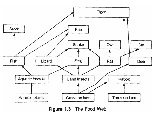The food chain is not always linear but quite often complex in nature due to interlinking of chains. Such succession of species in interlinked chains are shown as food webs (Figure 13). Food chain studies help us in understanding the feeding relationships and interdependence between organisms in an ecosystem. They also help to understand the energy flow and material circulation in an ecosystem. What is particularly important for pollution scientists is the problem of biomagnification or bioaccumulalion of toxic substances. Some toxic pollutants, released into nature are not easily biodegradable. Such pollutants are heavy metals (e.g., mercury and lead), pesticides (e.g., DOT), etc. After such a substance enters the body tissue of an organism from polluted environment, its concentration in the tissue increases rapidly to a level much higher than that in the environment. This concentration goes on increasing from one trophic level to another as the substance enters into and moves up in the food chain. This phenomenon of cumulative build-up sequentially through the food chain of specific substances is called bioaccumulation or biomagnification. Organisms in higher trophic levels are naturally more bioaccumulative. Man, being a creature at a very high trophic level, suffers more from this. The concentration of a toxic substance in the natural polluted environment (say in a lake) may not be high but may exist at a dangerous level in the tissues of some organisms (say fish) which, if consumed by human beings, can be hazardous to health.