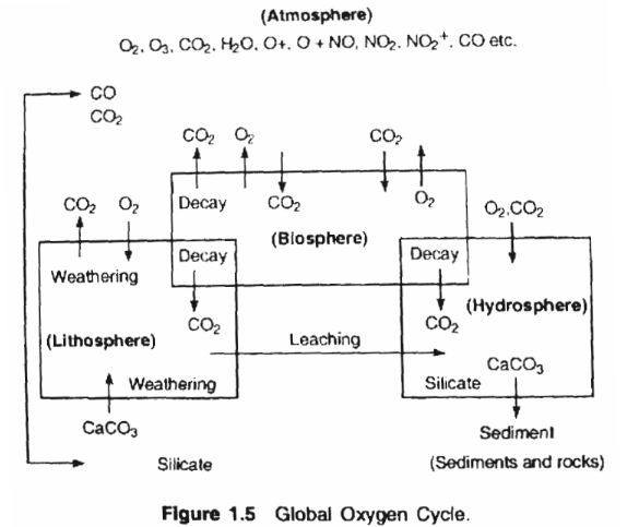 Oxygen cycle. Oxygen is an important element, which cycles predominantly in the atmosphere, hydrosphere and biosphere (Figure 1.5). It circulates mainly as O2, HjO and CO2. In sediments and rocks, it exists mainly as carbonates and silicates.