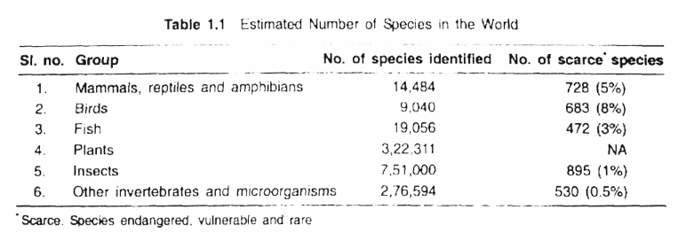 The present geological era perhaps enjoys the maximum biodiversity. Scientists have so far been able to identify approximately 1.4 million species. This, in fact, is a small fraction of the actual species diversity which is estimated to be more than 10 million. This at best is an approximation. The terrestrial ecosystems are more rich in species diversity than the marine ones in a ratio of about 7:1. We have no idea about genetic diversity. As per the World Development Report, 1992, Table 1.1 gives the data on estimated number of species in the world.