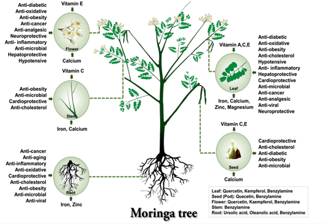 Moringa (Moringa oleifera) is highly valued for its exceptional nutritional content. Various parts of the Moringa plant, including the leaves, seeds, and pods, offer a rich array of essential vitamins, minerals, proteins, and antioxidants. Here is an overview of the nutritional content of different parts of the Moringa plant: